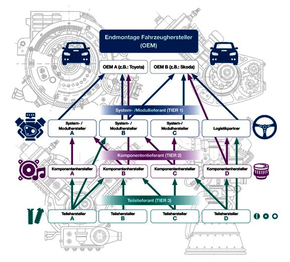 Wie nachfolgende Grafik zeigt, gliedert sich die Zulieferkette der OEM in sogenannte Tier-Ebenen. Als Tier-1-Zulieferer werden beispielsweise die direkten Lieferanten der OEM bezeichnet. Angenommen „Teile-Hersteller B“ erzeugt Schrauben und liefert seine Produkte sowohl an „Komponenten-Hersteller A“ als auch direkt an einen OEM. Dann ist „Teile-Hersteller B“ allerdings sowohl der Tier-3- als auch der Tier-1-Ebene zuzuordnen.