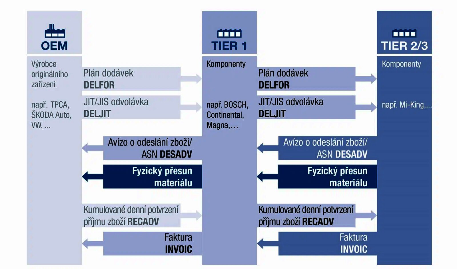Pro hladké a bezproblémové fungování JIT a JIS je však nezbytná neustálá a bezchybná komunikace mezi například výrobcem OEM a jeho dodavateli. A právě zde přichází ke slovu elektronická výměna dat (EDI). V ideálním případě by měli být všichni v dodavatelském řetězci vzájemně propojeni bez ohledu na hierarchické zařazení v pyramidě dodavatelů (TIER 1 - TIER 3). Pro automatizovanou výměnu informací mezi všemi účastníky lze použít různé standardy (EDIFACT, ODETTE, VDA, ANSI X.12...). Použitou normu dodavatelům obvykle určuje zákazník. Bez ohledu na to, který standard se skutečně používá, jsou procesy výměny informací vždy dosti podobné. Podívejme se na ně blíže pomocí následujícího schématu.