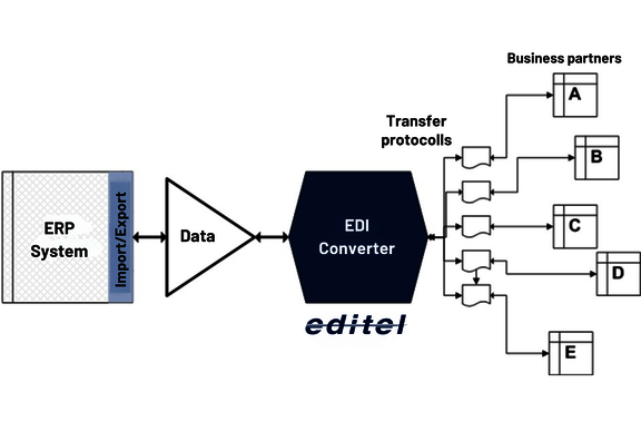 Ideally, EDI-related requirements are considered as early as the ERP implementation phase. However, this doesn’t mean that later integration is impossible — quite the opposite. The most important component of any EDI integration into an ERP system is the import and export of structured data. Within the ERP system, this is managed via an import/export interface. In most cases, ERP vendors offer this as an EDI module. Typically, ERP systems don’t generate EDIFACT files directly; instead, they use an in-house format that is then converted into the appropriate format for each partner with the help of an EDI converter (EDI provider).