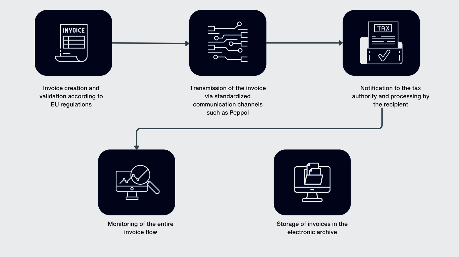 eInvoicing is far more than just sending invoices electronically — it represents an end-to-end digital invoicing process: from creation in the ERP system to validation, secure transmission, automated processing by the recipient, and legally compliant archiving.