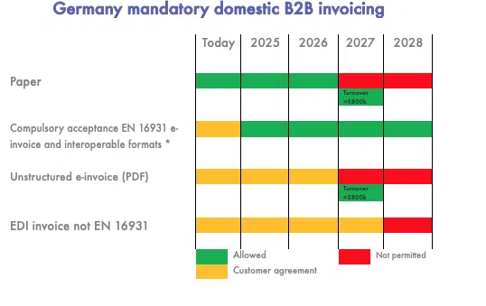 22 marca 2024 roku Niemiecki Bundesrat (Rada Federalna) zatwierdził ustawę w zakresie stopniowego wdrażania obowiązku stosowania e-faktury dla transakcji krajowych B2B (stopniowe wdrażanie zaplanowano lata 2025–2028) – schemat poniżej pochodzi z uzasadnienia do ustawy.
